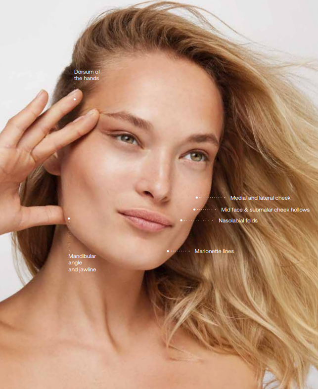 Radiesse is commonly used on the cheeks, jawline, chin, temples and hands. It is ideal for patients who want both volume restoration and skin rejuvenation.