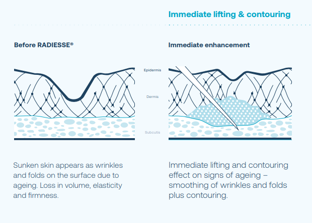 Radiesse delivers dual benefits. The gel carrier provides instant volume and structure, while the CaHA microspheres work beneath the skin to stimulate collagen production. As the gel is absorbed over time, the newly formed collagen continues to support and revitalise the skin. This makes Radiesse an ideal choice for patients seeking both immediate and longer-term rejuvenation.